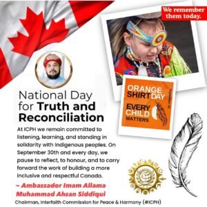 CANADA : The painful truths of this shared history are not far behind us; their impacts are still felt today. The Co-Chair Pakistan, International Religious Freedom Roundtable for Pakistan (IRF Pakistan) and the Interfaith Commission for Peace & Harmony (ICPH), led by His Eminence Ambassador at Large for global Peace and Human Rights Imam Allama Ahsan Siddiqui message On Canada National Day for Truth and Reconciliation , today is the National Day for Truth and Reconciliation. It occurs every year on September 30. It’s a time to reflect on Canada’s history and the impact of residential schools.